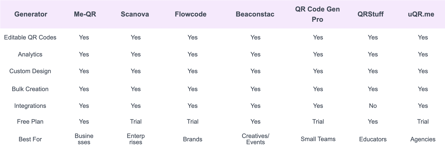 Me-QR এবং Beaconstac শক্তিশালী কাস্টমাইজেশন এবং ইন্টিগ্রেশন ক্ষমতা সহ সবচেয়ে বিস্তৃত বৈশিষ্ট্য সেট অফার করে। Scanova এন্টারপ্রাইজ বৈশিষ্ট্য এবং সুরক্ষায় নেতৃত্ব দেয়, যেখানে Flowcode গোপনীয়তা-সচেতন বিশ্লেষণ এবং ডিজাইন বিকল্পগুলিতে শ্রেষ্ঠত্ব অর্জন করে। QR কোড জেনারেটর প্রো ছোট ব্যবসার জন্য চমৎকার মূল্য প্রদান করে, QRStuff নির্ভরযোগ্য সরলতা প্রদান করে এবং uQR.me এজেন্সি ব্যবস্থাপনায় বিশেষজ্ঞ।