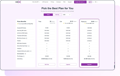 ME-QR's priser ($9/måned eller $69/år for Lite-abonnementet; $15/måned eller $99/år for Premium) afspejler omfattende funktionalitet inden for en enkelt platform. Beaconstacs gratis abonnement virker mere overkommeligt, men adgang til avancerede funktioner kan kræve qrcodemonkey.net-abonnementer, hvilket potentielt kan øge de samlede omkostninger. ME-QR's altomfattende priser giver gennemsigtighed.