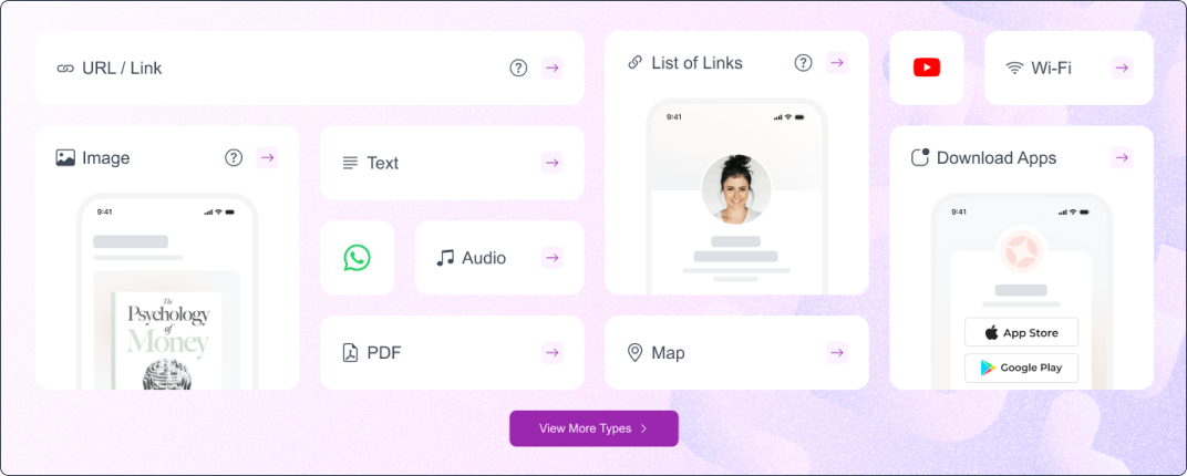 Me-QR menyokong pelbagai jenis kod QR, memenuhi pelbagai keperluan perniagaan. Sama ada anda memerlukan kod QR untuk tapak web, PDF, kad perniagaan, pautan pembayaran atau halaman media sosial, Me-QR menawarkan pilihan yang fleksibel untuk menjana kod QR yang betul untuk sebarang senario.