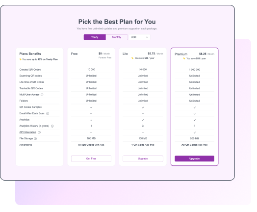 Me-QR menawarkan struktur harga yang lebih fleksibel dan telus, menjadikannya pilihan ideal untuk pengguna yang memerlukan penciptaan dan imbasan kod QR tanpa had. Dengan Me-QR, pengguna boleh menjana sehingga 10,000 kod QR dan menikmati imbasan tanpa had dan seumur hidup kod QR tanpa had, walaupun pada pelan percuma. Selain itu, penjejakan kod QR tersedia tanpa sekatan dan pengguna mendapat manfaat daripada akses berbilang pengguna dan penyepaduan API pada semua rancangan.
