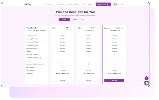 Pendekatan kepada pelan percuma dan berbayar mendedahkan perbezaan ketara antara ME-QR dan QRFY. ME-QR mengambil pendekatan yang murah hati dengan peringkat percumanya, menawarkan penjanaan kod QR tanpa had untuk kedua-dua kod QR statik dan dinamik. Lebih mengagumkan lagi, kod dinamik kekal aktif selama-lamanya tanpa memerlukan sebarang peningkatan, menjadikan ME-QR sangat praktikal untuk pengguna yang memerlukan kebolehpercayaan jangka panjang.